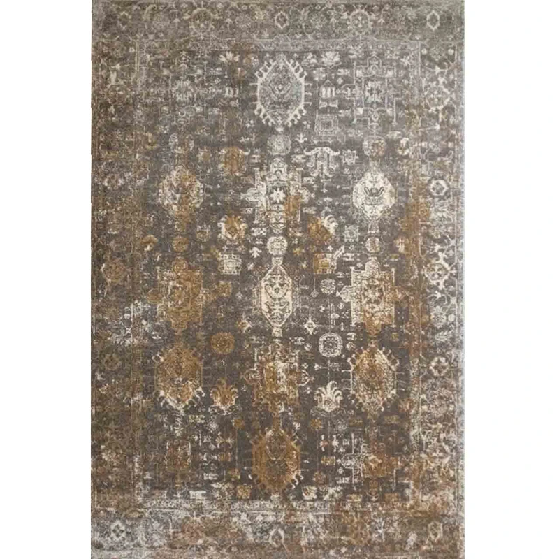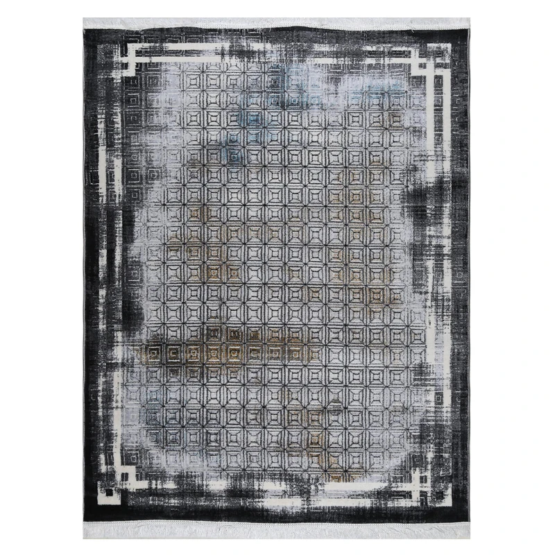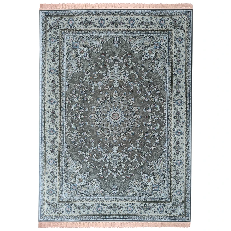 Subtle oriental design in smoke grey and blue tones, ideal as an accent rug.
