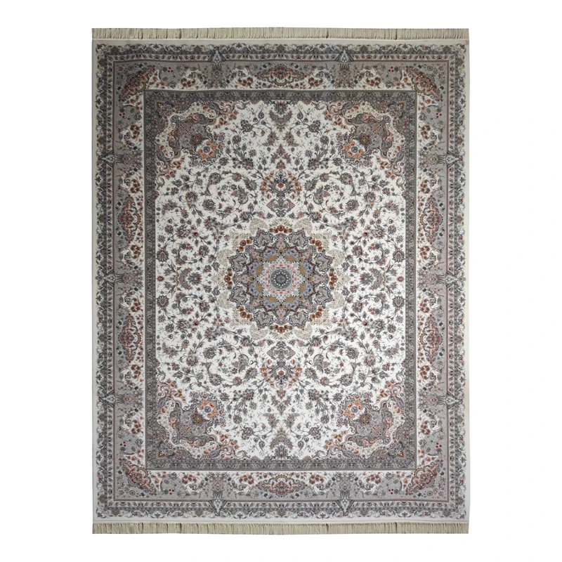 Classic bordered rug in soft cream with rich accent colours, ideal for dining rooms.